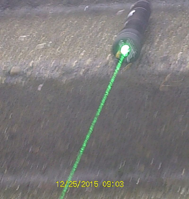 Beam photograph (single cell mode) in daylight with the laser directed at an unoccupied white trailer approx. 200' (~61M) downrange.