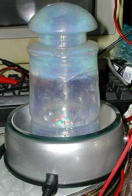 What it's *supposed* to do though, is give you a mirrored surface to put clear glass or crystal articles on, and have them slowly rotate while 7 colored LEDs shine up through the lamp's center and shine into the object you place on it. The LEDs can be run through 7 different patterns, selectable through a red pushbutton on the side of the lamp. You can also turn the motor on or off if you wish with a black pushbutton switch on the side of the lamp, located 90 degrees away from the red button.