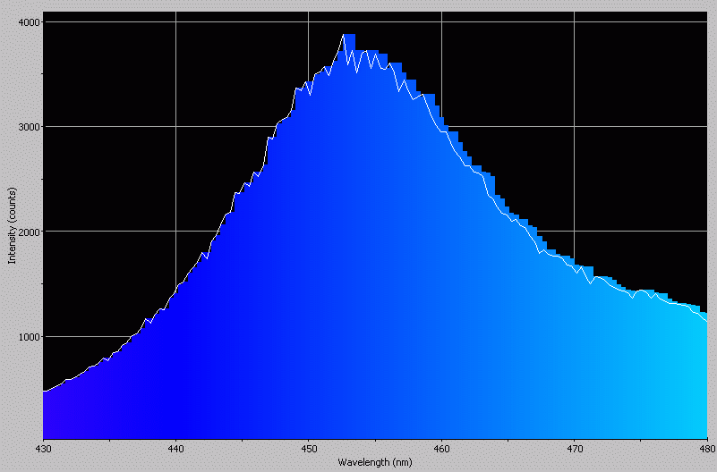 Spectrographic analysis of the LEDs in this flashlight; spectrometer's response narrowed to a band between 430nm and 480nm to pinpoint native emission peak wavelength, which is 452.537nm.