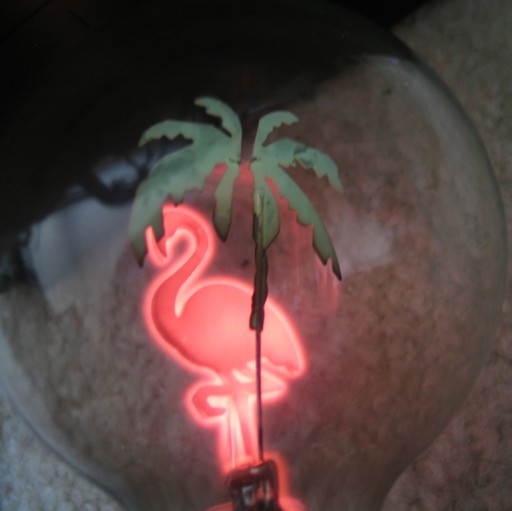 Photograph of the "Flamingo & Palm Tree" lamp operating.