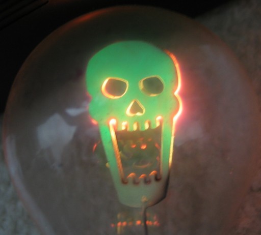 Photograph of the "Screaming Skull" lamp operating.
