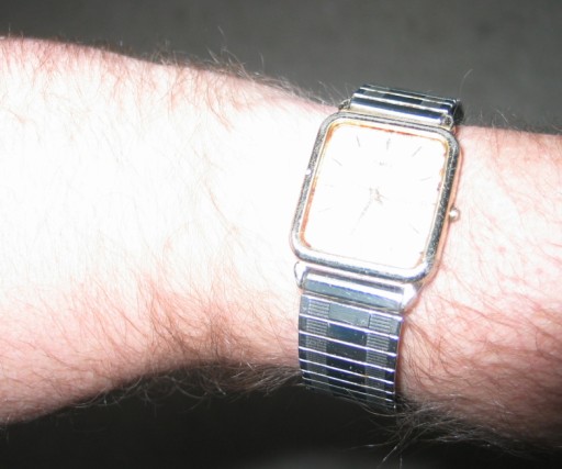 Photograph of the watch in its natural habitat -- on my wrist of course.