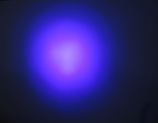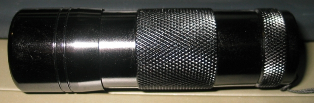 This unnamed flashlight is an aluminum-bodied light that has 9 UVA (advertised as 370nm; spectrograpically measured at 394.80nm) LEDs in the end, powered by three AAA cells held in a side-by-side carriage in the barrel.
