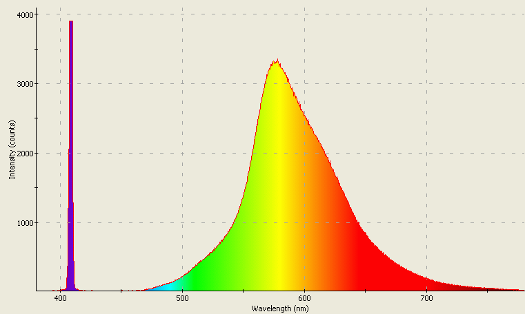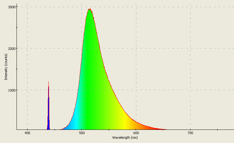 Spectrographic analysis of the fluorescence of the outer casing of the yellow tape measure from this set when irradiated with the 5mW Violet Laser Module.
