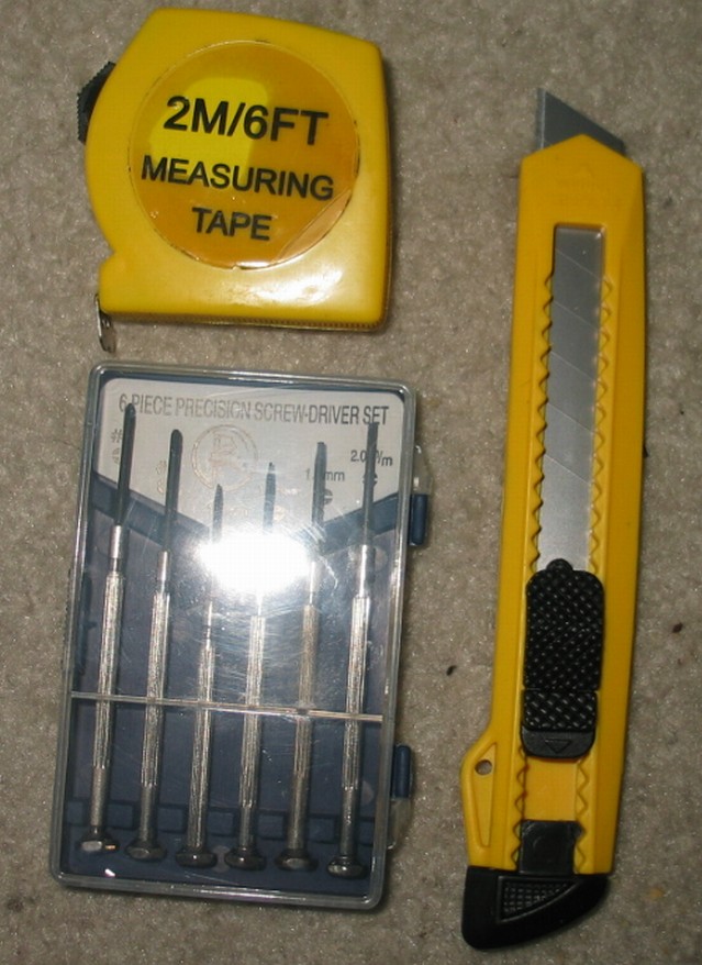 This is the Value Tool Set, consisting of a 6 foot tape measure, a type of carpet knife with a long "break-away" blade that gives you a fresh blade when the one you've been using goes to pot, and a set of six jewleller's screwdrivers in their own plastic case.