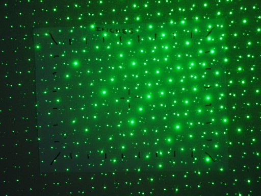 But what sets this laser module apart from most others you can get isn't the MCA, and it isn't the AAA cells it feeds from. It's that moveable holographic diffraction grating optic on the unit's "business end" that allows it to project "stars" when the button is pressed, rather than just a single dot like most other laser modules. This grating can be rotated to project any of quite literally HUNDREDS of different patterns.