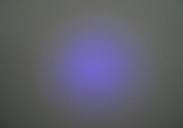 The UVA output of 385nm is shorter in wavelength than what is normally found in "money checkers" or other UV flashlights, so its output will appear dimmer to the eye. But don't let that sickly, weak purple glow fool you. Please do not shine it in your eyes, other people's eyes, or pet's eyes. This light emits copious amounts of UVA radiation, and that isn't very good for the eyes if stared directly into.