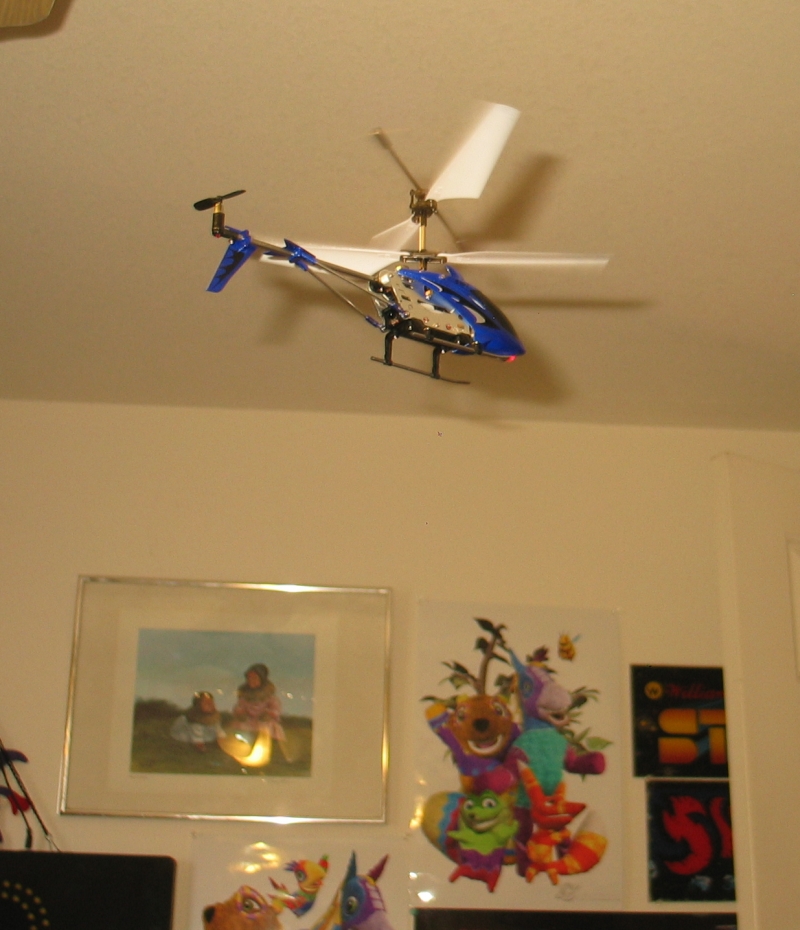Before I had the camera "rolling", I attempted a test flight without the tail rotor blades; it hung in the air for several seconds and then abruptly dropped to the floor -- deader than a doorknob. The heli's power had shut down, and I rather quickly detected the odour of burnt circuitry when I picked it up to examine it. Once I power cycled it, power stayed on, and no smoke issued from it; though the tail rotor motor had slowed considerably.