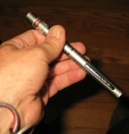 Insert two new AAA cells into the barrel, button-end (+) positive first. This is the opposite of how batteries are installed in most flashlights, so please pay attention to polarity here.