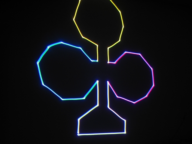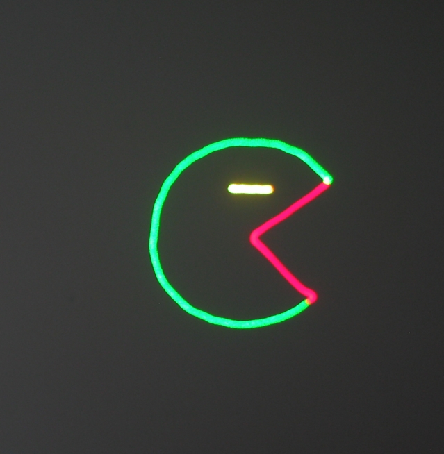 The scanners (galvos) are advertised to operate at 10K (which I believe means 10,000 points per second), allowing fully animated, fairly complex drawings to be made instead of having simple Lissajous scanners (that can draw mainly variations of loops and such only) found in other laser show projectors.