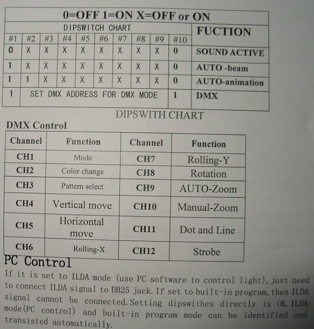 ILDA is a whole beast of it's own. It allows you to use a computer with an ILDA adapter to directly control the galvos. What this means is you can draw a show from scratch (or download a show from the internet) on your computer and then have the laser display it. To use this mode you will need a DAC, ILDA software and a DB-25 cable. You plug the cable in and run the show on the computer and the laser will automatically switch regardless of dip switch settings.