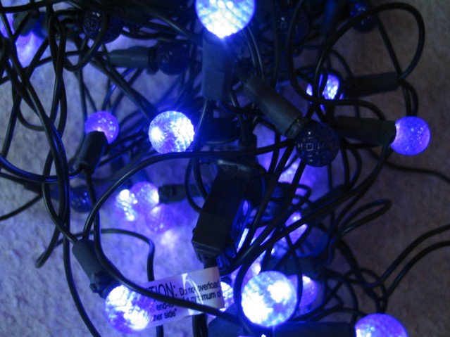 Do you live in California or Washington and pay so much for power you can no longer afford to put up lights anymore? Then these are for you: A fairly ordinary looking set of Christmas lights that have sparkling purple LEDs instead of bulbs. They run cool and the bulbs never pop, and the whole set uses just a few watts (4.8 watts, to be precise) of your precious electricity.