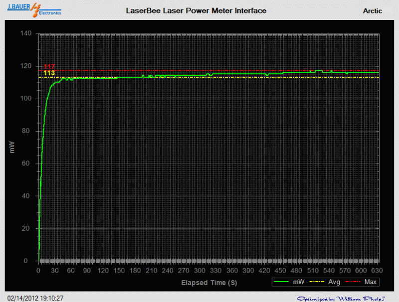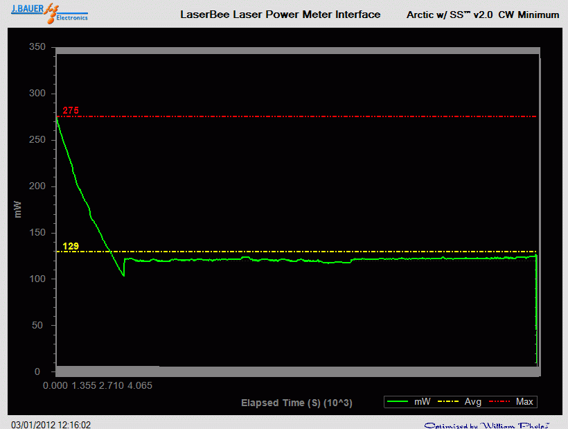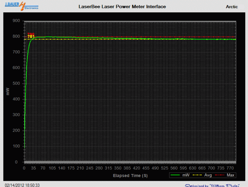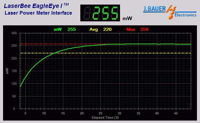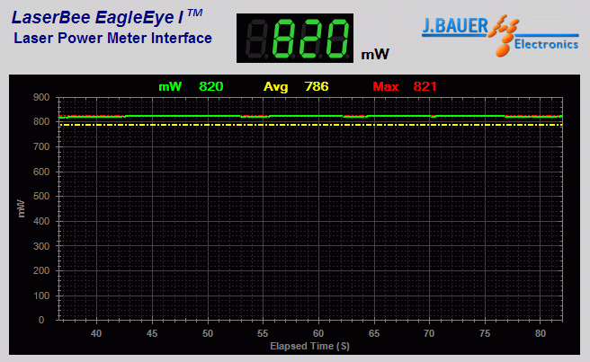 Measures 256mW (low) and 821mW (high) on a LaserBee 2.5W USB Laser Power Meter w/Thermopile.
