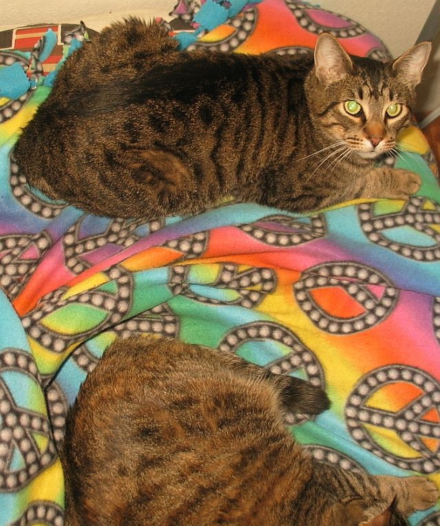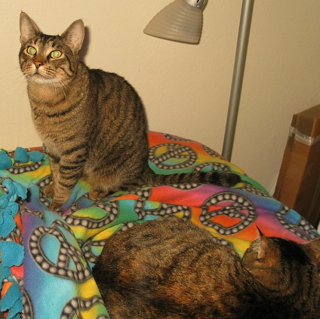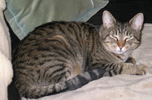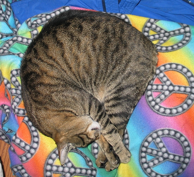 The above three photographs (the first two showing him sharing the bed with Baby -- who hissed loudly and multiple times at him just the day before!) were taken on the afternoon of 02-04-12 (or "04 Feb. 2012" or even "Feb. 04, Twenty Stick Very-Twirly-Stick" if you prefer).