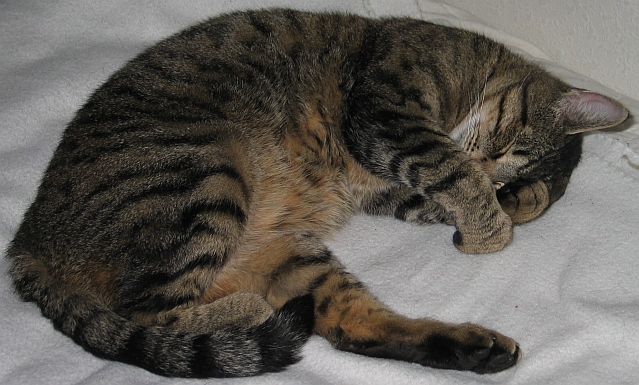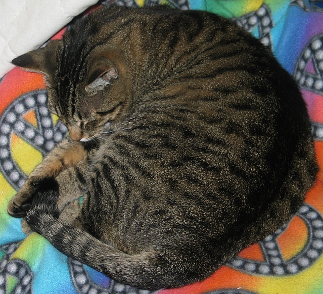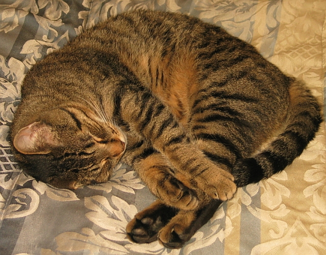 The above shows Bear-Bear doing one of his favourite things (besides meowing, purring, and attempting to climb up my leg at mealtimes) -- SLEEPING of course!!!