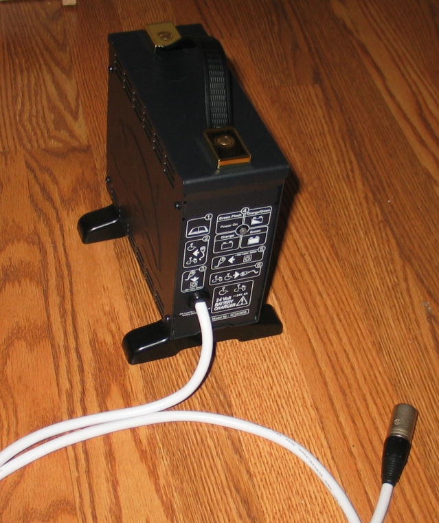 5. Plug the 3-pin circular plug on the end of the smaller-diameter charger cord into the offboard charger port (this is located under the control area (where the joystick and mode change buttons are).