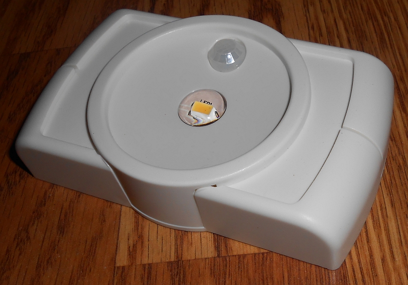 This is a motion-sensing undercabinet LED light, designed to be mounted underneath kitchen cabinets; this light automatically turns on when it senses somebody's hands near the countertop anywhere even reasonably close to the light and then automatically turns itself back off approx. 30 or 60 seconds later. It is completely self-contained (battery powered); no need to have costly hard-wiring done.