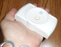 The Motion-Sensing Under-Cabinet LED Light come in a sturdy UV-resistant ABS plastic body in two colors (off-white and brown); its high-powered SMD neutral white LED is protected by a thin, transparent, water-clear domed plastic lens, and it operates from four AA cells.