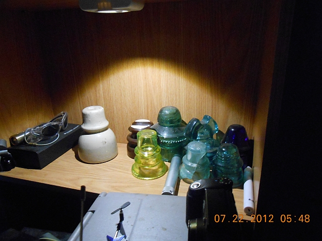 Photograph of a shelving unit (cabinet-like in its configuration!) solely illuminated by this product.