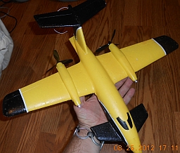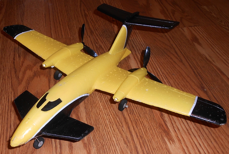 This is a medium-sized (18" (45.7cm) wingspan), lightweight, easy-to-fly remote controlled airplane. It has two motors (not just one like many other R/C aircraft), and is steered by varying the power to each motor, not with an adjustable horizontal stabiliser like single-engine R/C airplanes (and most real airplanes for that matter) have. Its propellers have three blades, not two like most other R/C airplanes. And it has wheels so it can take off from and land on hard surfaces such as sidewalks and unused streets.