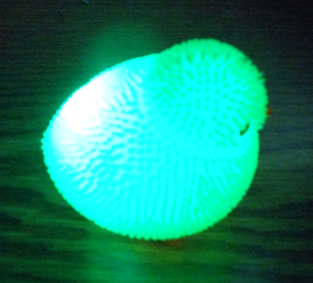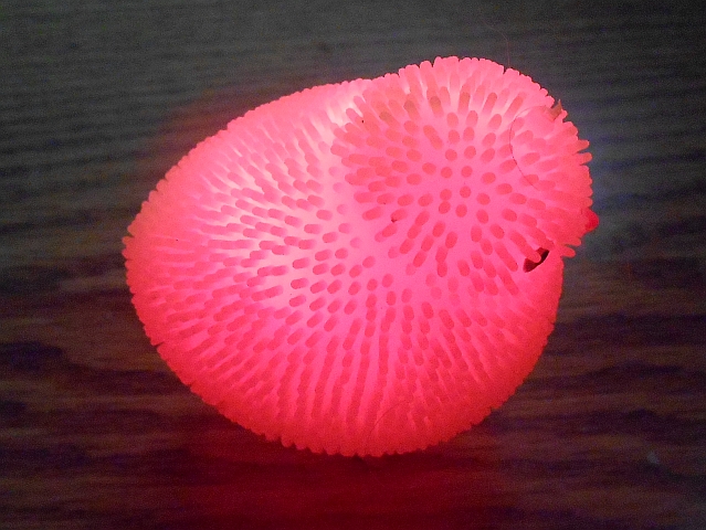 It features two bright blinking LEDs inside (one red, the other blue) that are activated by hitting it in the palm of your hand -- the LEDs blink for 13 seconds (timed on a clock with a second hand on it); then they self-terminate.