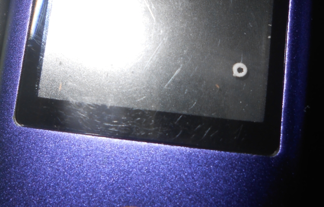 Photograph of the unit's screen, showing this curious white toroidal (doughnut-shaped) object -- possibly a washer -- between the display itself and its protective plastic window.