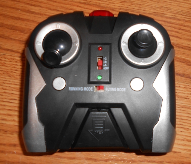 1: On the remote control, turn the "OFF/A/B/C" switch to the "A" position. Directly below that, you'll see another slide switch labelled, "RUNNING MODE" to its left and, "FLYING MODE" to its right. Slide this switch according to how you want the Vehi-Cross to behave.