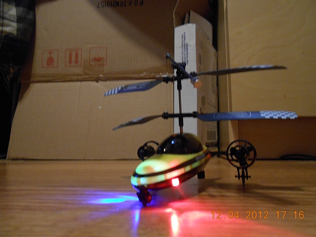 This is a fairly small, lightweight (as a helicopter in a plastic body goes), easy-to-fly 3-channel remote-controlled indoor ground racer/helicoper. Its remote uses IR (infrared) radiation in leiu of radio waves, so you'll note the conspicuous absence of an antenna on the remote control. This also means that the helicopter is designed exclusively to be flown indoors -- though you can indeed fly it outside after sunset if there's no (or extremely little at worst) breeze.