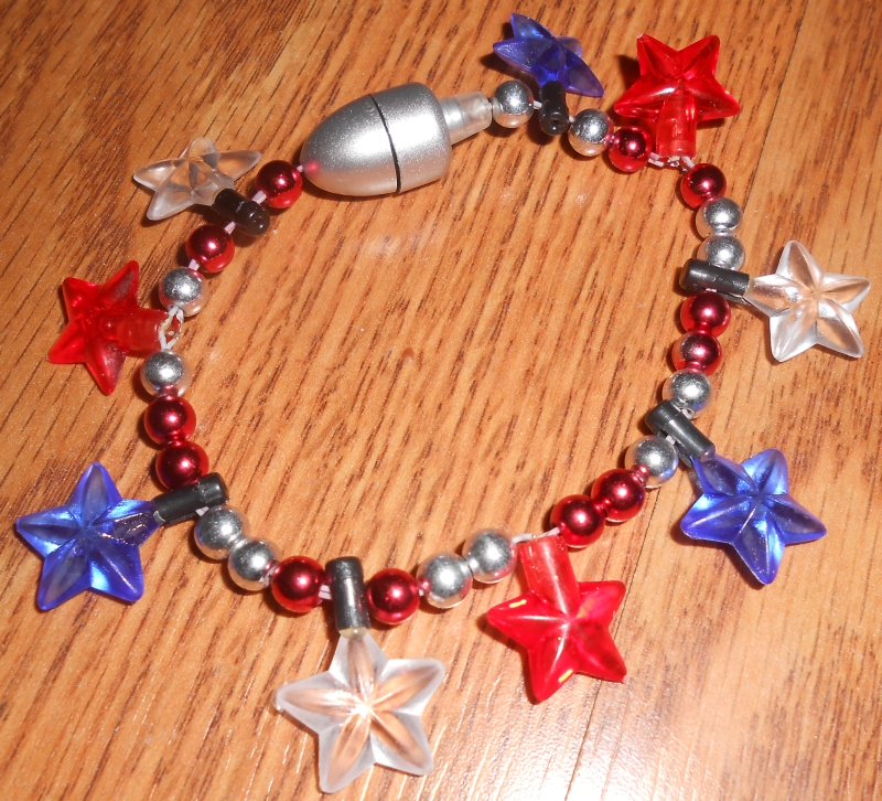 This is a flashing plastic bracelet, designed to be used on or near Independence Day (July 04) in the United States.