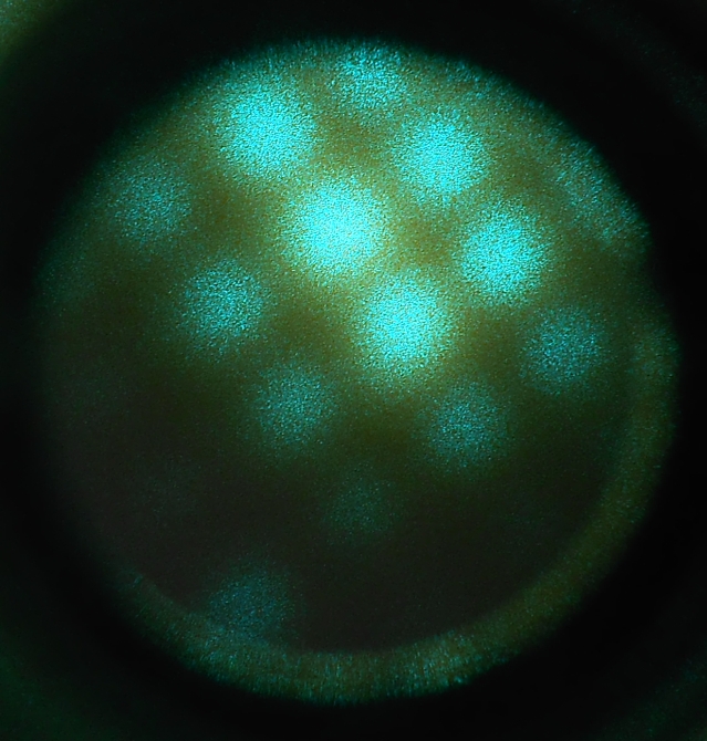 My Novalux Laser 2000 Protera Model 488-15 Blue-Green Laser was used here to obtain the photograph because its wavelength lies at the longer end of the phosphor's acceptance band and therefore does not seriously overload the camera's imager.