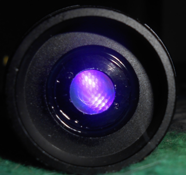 This photograph was taken with the Arctic (440nm) laser beaming into the output-end of the PhosForce; instead of a blazing white light, a somewhat feeble blue light is transmitted -- feeble enough that it didn't overload the camera's CCD imager even when the camera was virtually head-on and an unfiltered laser beam would destroy it.