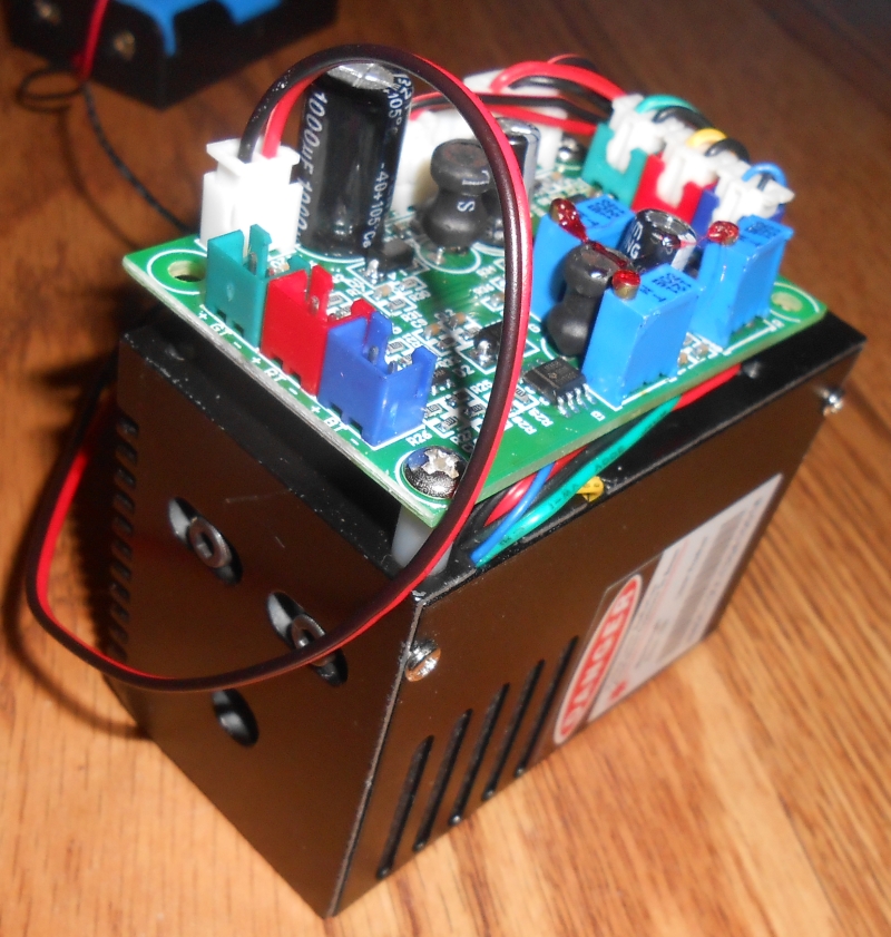 ) "White Light" (RGB) 400mW Laser, take the included wire & connector combo (the one with red & black wires), and plug it into the shielded male receptacle on the corner nearest that large 1000µF electrolytic capacitor (the tallest component on the board; a large cylindrical (pop can-shaped) thing.