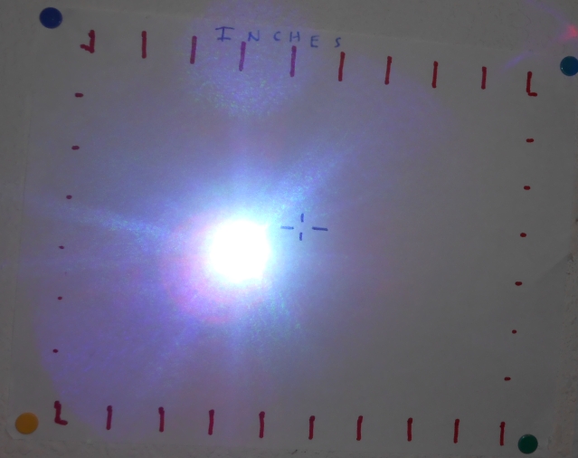 Beam photograph on a wall at ~55 feet to show that the laser's beams are not perfectly aligned.