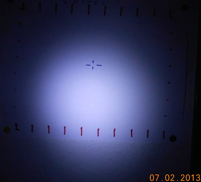 Beam photograph (flashlight mode) on a wall at ~10 feet.