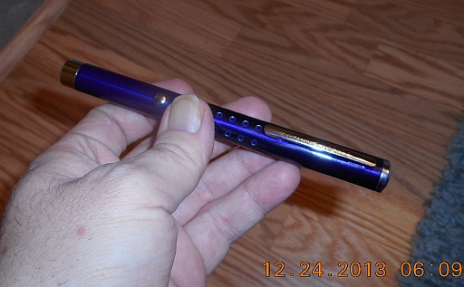 This is a green DPSS (diode pumped solid state) portable laser. It comes in what I believe is a brass body sporting a handsome blue finish with shiny chrome-colored trim.