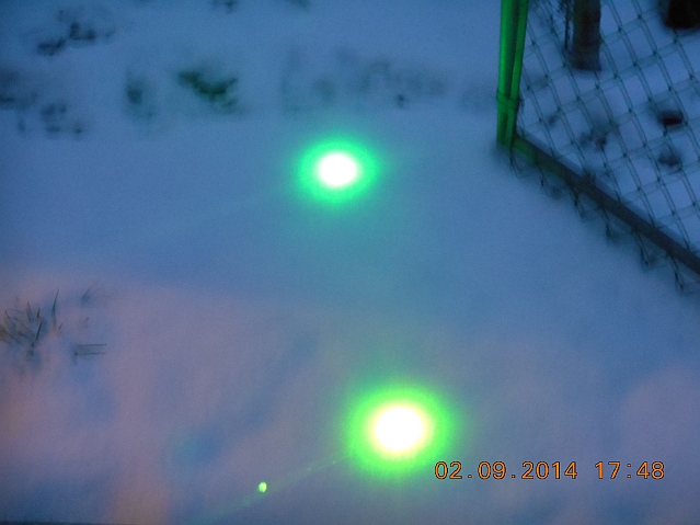 Beam terminus photograph on freshly-fallen snow comparing this laser with the Directly-Injected 5mW 515nm Green Laser Pen.