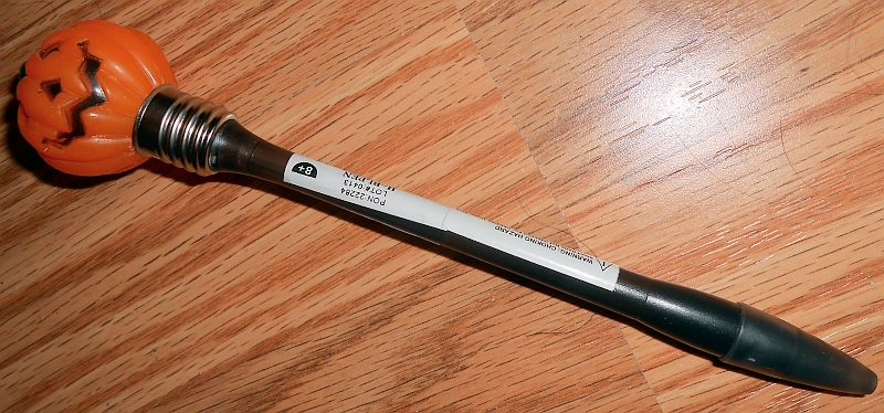 The Bump & Flash Halloween Pen is a seasonal-use (Halloween of course in this case!) ballpoint pen that has a pumpkin-shaped rubbery top and a medium-point ballpoint pen at the bottom (well, it's a PEN, duuuuhhhh!!!), But the reason that this pen ended up on this website are the red and yellow LEDs under the Jack O' Lantern-shaped top that flash when the pen is "bumped" against a reasonably hard surface such as a desk, table, countertop, etc; or even if it is struck fairly lightly against your arm.