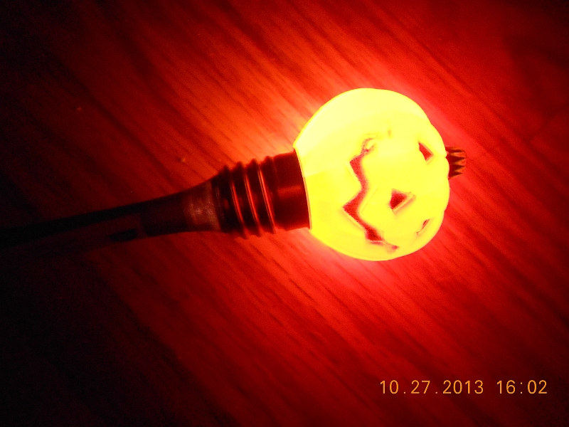Photo of the "pumpkin"-shaped end of this pen when illuminated by the inbuilt LEDs.