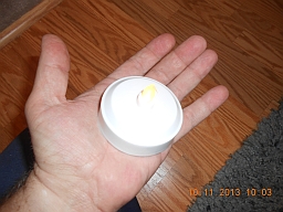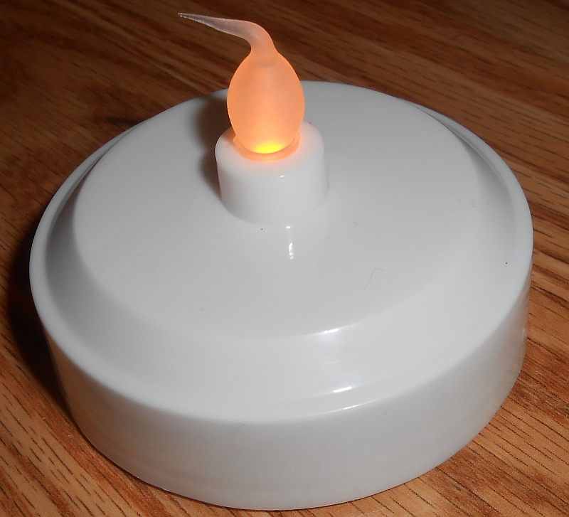 The LED Tea Light is a household lamp, not a flashlight. So I won't hit it against the concrete floor of a patio, throw it in the toilet, stomp on it, throw it against a wall, run over it with a 450lb electric wheelchair, let my mother's cats, my sister's kitty, or my own adorable little fuzzbomb piddle (uranate) on it, sit on it really hard, or subject it to any other potentially destructive tests that a regular flashlight might be subject to. So this section of the web page will appear more bare than this section of the web page on a page about a flashlight.