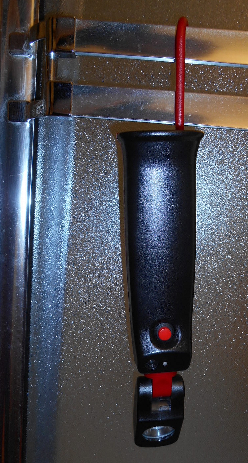 To use the hanging hook, just pull it out from the base of the unit, and (what else) hang it from a pipe, the hood latch on an automobile, or any other surface with a diameter of no more than 28mm. The hook rotates over a full 360° range, so you can easily position it any way you like.