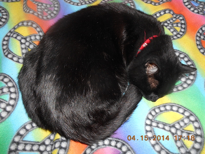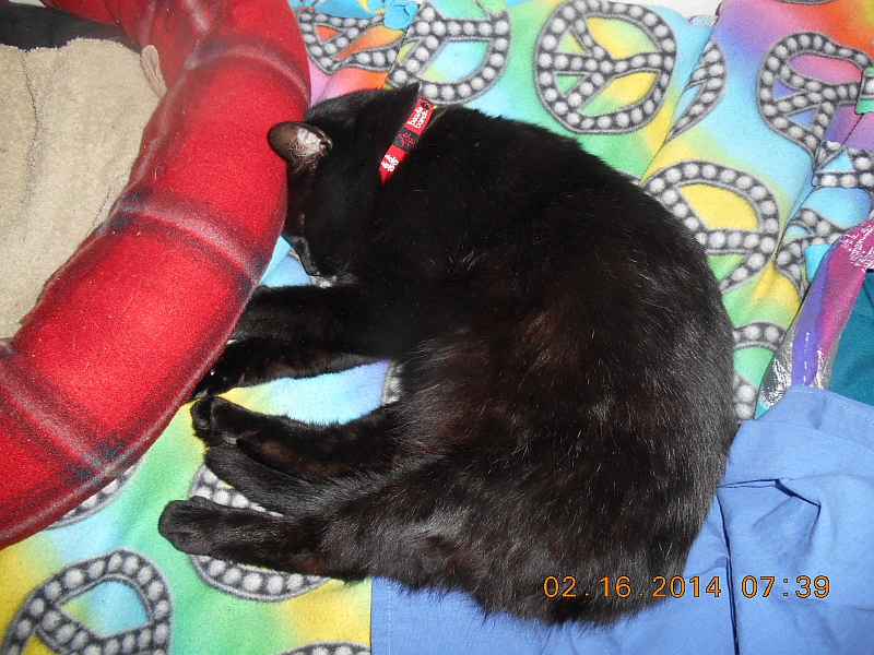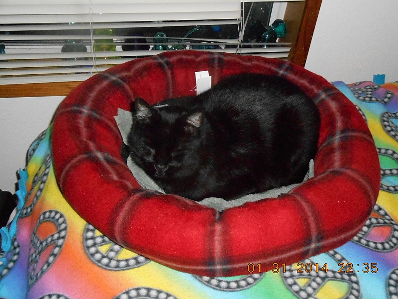 This pic of Stormy in my special little furkid Nikki's bed was taken on the evening of 01-31-14.