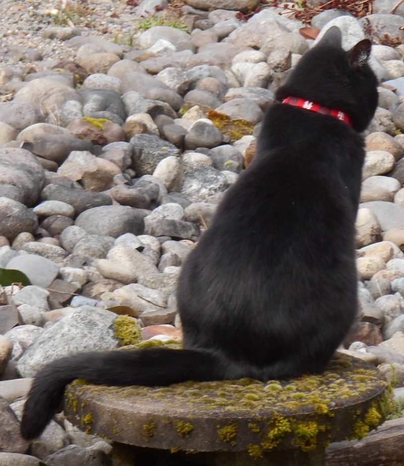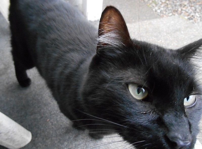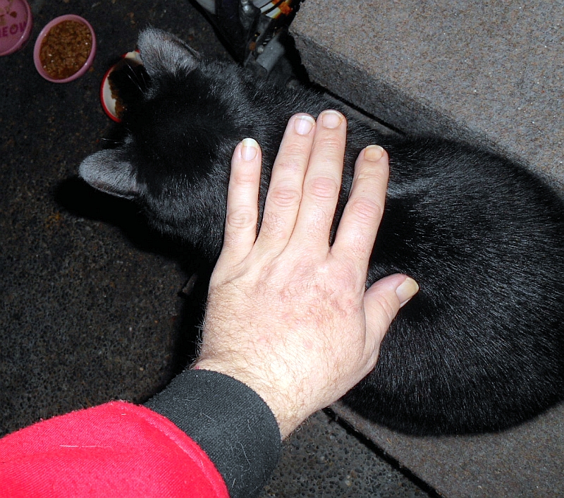 Stormy (my mother & sister had originally named him Smokey, but they both realised a short time later that both had cats named Smokey in the past) came to our back porch around the 1st of December 2013; he would meow quite loudly for food. I soon found that I could pet him even while he ate, and eventually (just a few days actually) he would jump into my lap. When he did so, he would almost immediately start purring.