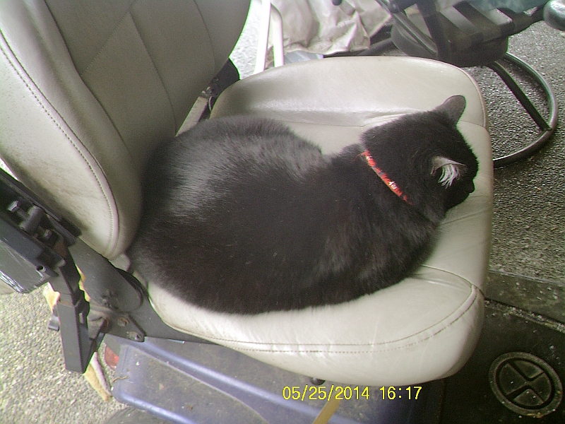 This pic shows our adorable little furkid curled up asleep on the seat of my Pride® Celebrity X3 Scooter on the afternoon of 05-25-14.