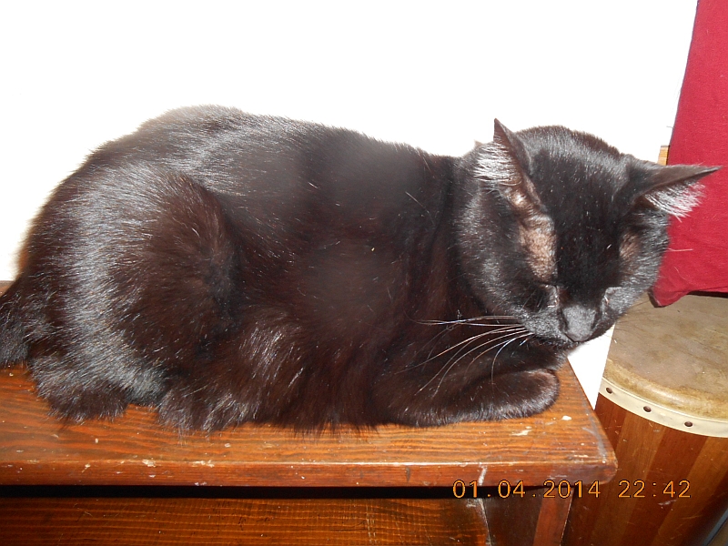 This pic of Stormy resting on top of the shelving unit by the back door was taken on the evening of 01-04-14.