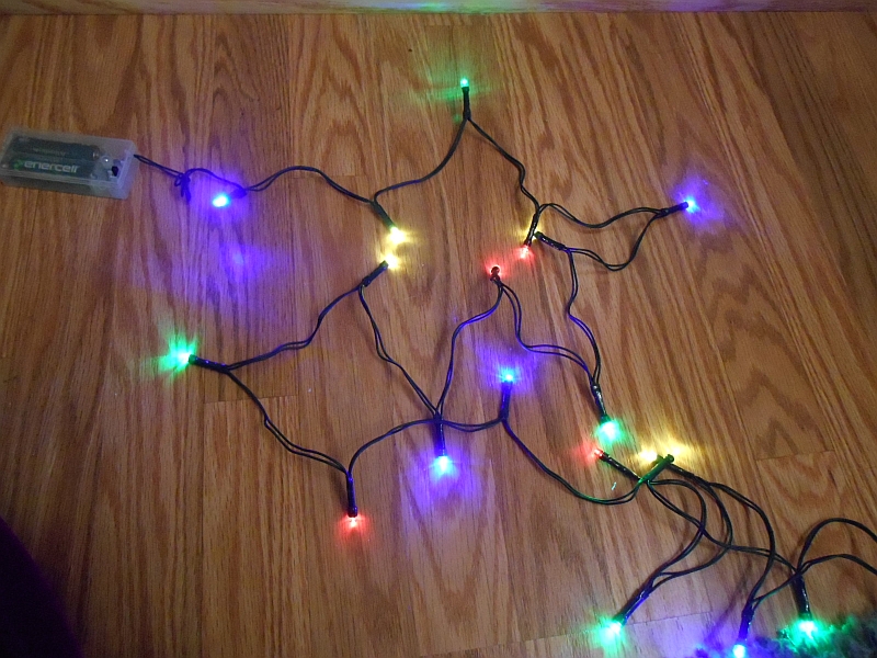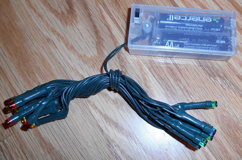 The LED Battery-Operated Christmas Lights is a battery-powered set of LED holiday lights that feature 20 3mm LEDs with inverse conical lenses on a cord attached to a box containing two AA cells and a slide switch that turns them on in steady mode and off.