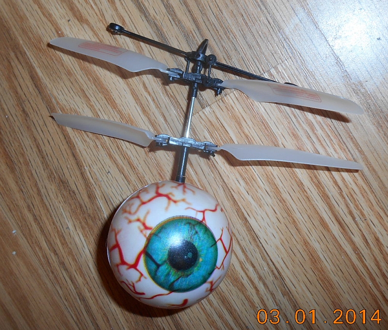 The "Rebound" Autonomous Flying Eyeball (hereinafter, probably just called the Rebound) is a rather interesting flying toy. Yes, it does have a remote control, but it has but one bunghole...er...uh...I mean IT HAS BUT ONE FUNCTION which is to turn the rotor blades on and off. Once you have it in the air, you simply let it do the "driving" while you watch it bounce up & down and avoid things like couches and chairs.