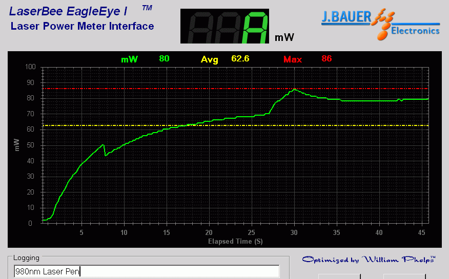Power output tops out at 86mW on a LaserBee 2.5W USB Laser Power Meter w/Thermopile.