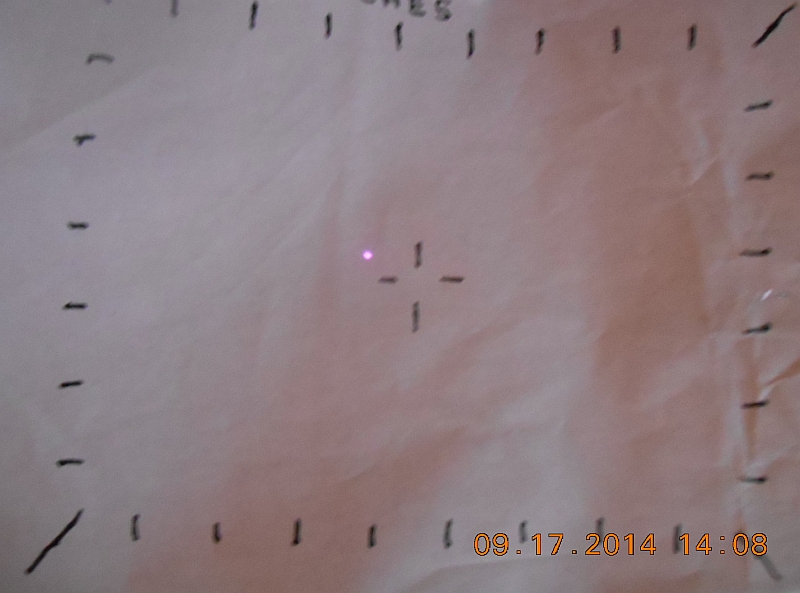 Beam terminus photograph on a wall at ~2 feet (~0.6096 meters); my Olympus Brio D100 Digital Camera was used.