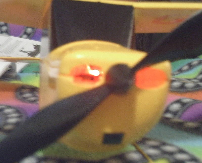 The Champ has now failed...the red light in its fuselage comes on, but it can no longer bind with its radio -- meaning the propeller and all control surfaces are inactive and as a result, the gay little foam airplane can no longer be flown.