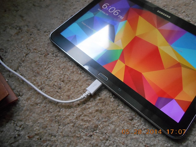To charge it, take the white cord with a USB connector at one end, plug it into the receptacle on the white "wall wart" for it, plug the "wall wart" into any convenient standard (in north America anyway) 110VAC to 130VAC 60Hz AC receptacle (or, "wall outlet" or even, "wall socket" if you prefer) and plug the small plug on the end of the cord into the female receptacle for it on the lower edge of the Tab4, as you see in the following photograph.